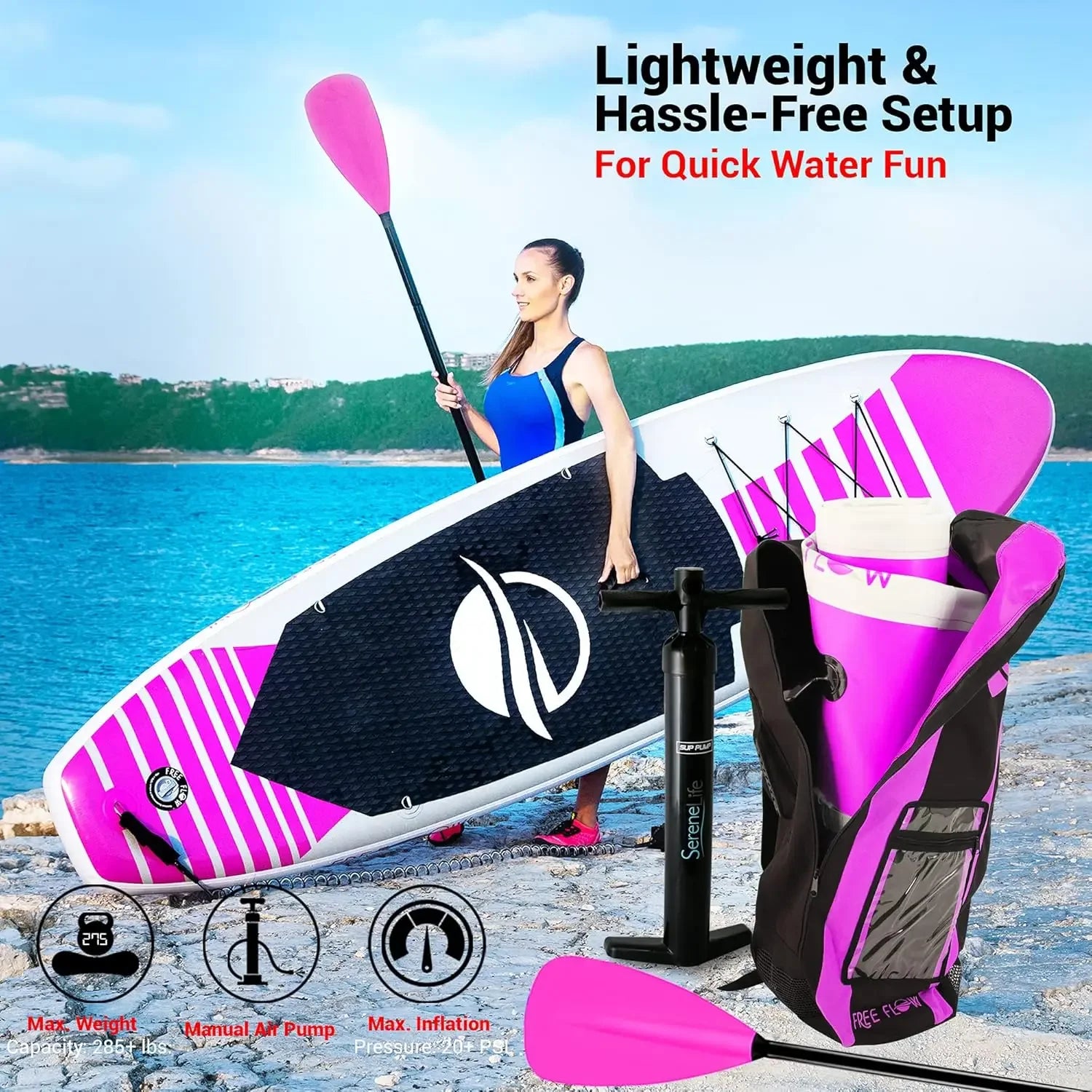 SereneLife Inflatable Stand Up Paddle Board — a non-slip SUP that arrives with a paddle, pump, leash, and a complete accessories kit. Designed for beginners and seasoned paddlers alike, this inflatable board delivers stability, portability, and performance on the water in a sleek pink style.